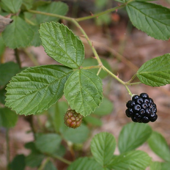 Erect, woody perennial armed with stout, straight or hooked prickles from an expanded base. Leaflets 3(5), oblanceolate to obovate, widest well above the middle, densely and and closely white or gray tomentose beneath. Flowers white, 1-3, on ascending, eglandular pedicels, all or mostly subtended by leaves with expanded blade. Fruit a black cluster of drupelets remaining attached to the receptacle at maturity; pedicels eglandular.