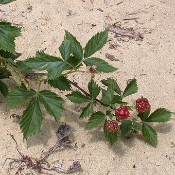 Woody perennial; primocanes prostrate or low-arching, not glaucous, often rooting at the tips; stems armed with stout, straight or hooked prickles from an expanded base; bristles lacking but minute glandular hairs may be present. Leaflets 3(5), oblanceolate to obovate, widest well above the middle, densely and and closely white or gray tomentose beneath; terminal leaflet of trifoliate floricane leaves broadly rounded to subcordate at the base and sharply acute to long-acuminate at the apex. Inflorescence leafy, flowers solitary and terminal or 2-5; pedicels elongate and erect, those of the lower flowers subtended by a trifoliate leaf or by a simple leaf with an expanded base. Fruit a cluster of drupelets remaining attached to the receptacle, black at maturity, sour.