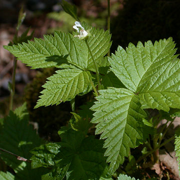 Creeping perennial. Stems herbaceous, without bristles or prickles. Leaves trifoliate; terminal leaflets sharply toothed above the middle, acute, the laterals asymmetrical; stipules oblanceolate. Flowers 1-3, terminal; petals white or rarely pink. Fruit deep red, the drupelets separating reluctantly from the receptacle.