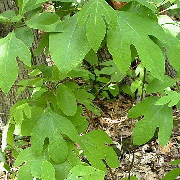 Deciduous shrub or tree to 30 m. Twigs aromatic. Older bark deeply furrowed. Leaves on long petioles, entire or with 2-3 rounded lobes, with 3 main veins. Dioecous. Flowers greenish-yellow, on wood from the previous season; tepals 6, persistent; stamens 9. Fruit blue