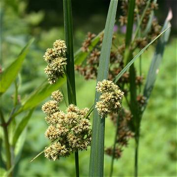 Herbaceous perennial from a stout rhizome, to 5' high. Leaves alternate, strap-like, dark green; lower leaf blades and sheaths distinctly nodulose-septate; stems tufted, the cauline leaves fewer than 10. Culms terete to bluntly triangular above. Bracts subtending the inflorescence conspicuous, composed of 2 or more flat or flattish blades quite unlike the culm, usually spreading or reflexed.