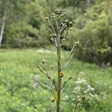Herbaceous perennial to 2 m high. Leaves opposite, blades ovate to lance-ovate, acuminate, serrate or doubly-serrate, truncate to rounded at the base; petioles slender, not margined, usually less than a third as long as the blade. Stems glabrous below, the faces shallowly grooved or flat. Inflorescence large, terminal, paniculiform, loosely and irregularly branched, tending to be cylindric; flowers zygomorphic; corolla bilabiate, the upper lip directed forward, 7-11 mm, dull red-brown except the lower lobe which tends to be yellowish-green.