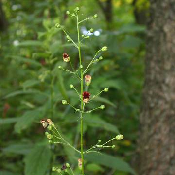 Inflorescence large, terminal, paniculiform, loosely and irregularly branched, tending to be pyramidal. Flowers zygomorphic. Corolla bilabiate, the upper lip directed forward, 5-8 mm wide, red-brown; 2-lobed, the lateral lobe of the lower lip also directed forward, the median lobe deflexed. Calyx regular, deeply saucer-shaped, divided to the middle into 5 broad, obtuse lobes. Stamens 4; sterile stamen brown or purplish, not greenish yellow, narrowly dilated, commonly longer than wide, situated under the upper corolla lip. Seeds angular, rugose, somewhat shiny, 4-7 mm long.