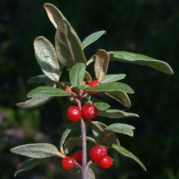 Deciduous shrub to 3 m; unarmed. Leaves opposite, green and nearly glabrous above, whitish below, ovate to lanceolate, obtuse to subcordate at the base. Dioecous. Flowers in small clusters on the growth of the previous season; stamens 8. Fruit red or yellow, 6-9 mm, bitter.