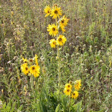 Coarse, taprooted, herbaceous perennial, to 12' high. Leaves basal and alternate, deeply pinnately divided or lobed, the lobes often further divided into pinnate or falcate segments, to 18" long. Stems leafy, glabrous. Head to 3" wide, in a narrow, sometimes racemiform inflorescence; rays yellow, mostly 17-25, to 5 cm long; disk flowers yellow; heads subtended by large, hairy, green bracts. Achenes large, smooth, dark.