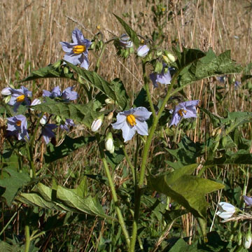 Spiny, rhizomatous perennial to 1 m; stems erect, branching. Leaves to 12 cm long and half as wide, ovate, with 2-5 large teeth or shallow lobes on each side, more or less stellate hairy on both sides, the yellow centers of stellate hairs of lower leaf surfaces sessile, not elevated off the leaf surface. Inflorescence with several flowers, racemiform at maturity; corolla lavender or white, 2 cm wide; anthers equal, tapering to the tip; calyx to 7 mm long, stellate, sometimes with 1 or 2 short spines; fruit a yellow-orange, poisonous berry to 2 cm in diameter.