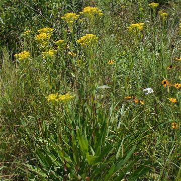 Herbaceous perennial. Lower and upper leaves dissimilar: the lowermost well developed and usually persistent, mostly more than 1 cm wide, tapered to the petiolate bases; the upper gradually reduced, becoming sessile with usually more of less sheathing or clasping bases. Leaves flat, obtuse to subacute, never 3-nerved. Stems and leaves glabrous. Flowers yellow; heads in flat or flattish-topped, corymbiform inflorescences; inflorescence branches and pedicels glabrous.