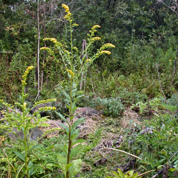 Herbaceous perennial to 2 m. Stems more or less strongly angled, glabrous below the inflorescence. Leaves strongly scabrous above; lower and upper leaves dissimilar; the lowermost 4-10 cm wide, sharply toothed, with a somewhat sheathing petiole; the upper gradually reduced but still toothed. Flowers yellow; heads in paniculiform inflorescences; inflorescence branches wide-spreading, recurved-secund; rays 5-12.