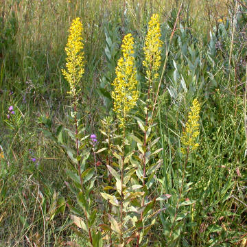 Upright perennial to 1.5 m. Stems glabrous or slightly scabrous. Leaves thick and firm, smooth, entire or slightly toothed; cauline leaves more than 25, gradually reduced in size from the base to and into the inflorescence; lower leaves less than 7 times as long as wide and scarcely sheathing at the base. Inflorescence a dense, terminal thyrse; heads not secund on the branches; rays 6-8; disk flowers 7-9.