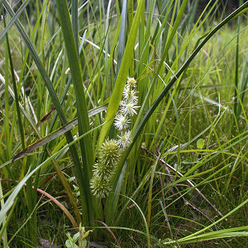 Herbaceous perennial to 1 m high. Leaves to 1.2 cm wide and up to 1 m long, usually thin and flat but sometimes weakly keeled; bracts often dilated at the base. Inflorescence simple or branched; flowers small, in globular heads, tepals 2/3 as long as the fruit, dilated at the tip; pistillate heads all axillary and subtended by bracts, 2-4 on the central axis and 1-3 on the branches, all sessile, stigmas and locule 1; stigma 1-1.5 mm; staminate heads 1-5 on the branches, 3-10 on the main axis; anthers and stigma linear. Fruits fusiform achenes, dull, sordid brown, 3-5 mm thick, in globular heads to 2 cm across.