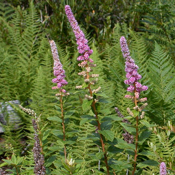 Sparsely branching woody shrub to 1.2 m. Leaves alternate, simple, finely serrate, prominently veined and densely tomentose below. Flowers in a terminal, elongate, branched panicle; sepals reflexed after anthesis; petals pink or rarely white, 3-4 mm wide; hypanthium tomentose; ovary superior. Fruit a pubescent follicle.
