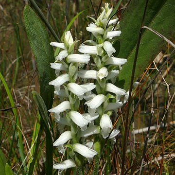 Perennial to 40 cm. Leaves typically remaining until anthesis and withering shortly after; flowers mostly 7.5 mm or longer, slightly tubularly campanulate, spreading to ascending, white, typically arranged in the inflorescence in 3-4 distinct vertical ranks; floral bracts nearly flat to moderately concave, either recurved, straight and spreading, or erect and weakly incurved, green or with prominent white hyaline margins or nearly wholly white; lateral sepals flattened, linear-lanceolate, acute, straight to slightly upwardly falcate, the tips often meeting the dorsal sepal and petals; labellum usually acuminate, abaxially white or very pale yellow, centrally smooth and yellowish (sometimes faintly), margin crisped and lacerate, abaxial glands spherical. 2n=45, 60.