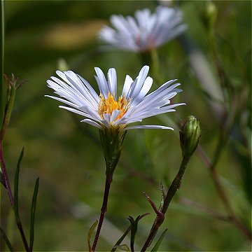 Perennial from long rhizome usually less than 2 mm thick; stems 15-100 cm. Stem leaves somewhat petiolate, scabrous, narrowly linear (rush-like), mostly less than 6 mm wide Heads few on short peduncles, subcorymbose in diffuse, short, terminal inflorescences; rays white or pale blue, mostly 30 or more, about 10 mm long.
