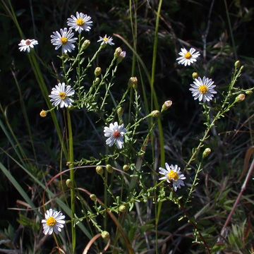 Herbaceous perennial; stems 30-100 cm; leaves linear to lance-linear or linear-elliptic, sessile, more or less entire, often scabrous above and glabrous beneath, chiefly cauline, leaves of the branches much reduced; inflorescence open, often diffuse; head usually numerous, long-pedunculate, the peduncles with numerous spreading or ascending, oblong or spatulate bracts and some of them 2 cm up to 15 cm; involucre glabrous, its bracts strongly imbricate, obtuse or dilated near the short broad green tip; rays 13-30, pale bluish or lavender, sometimes white, 5-9 mm; lobes of the disk corollas comprising 20-35% of the limb.