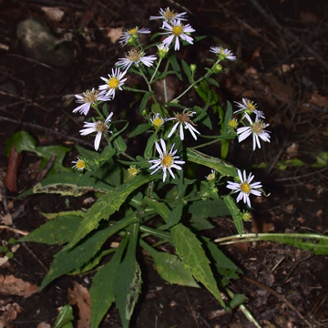 Herbaceous perennial from creeping rhizomes; stems 20-100 cm, often crooked, pubescent in lines becoming glabrate toward the base and uniformly pubescent below the heads; leaves mainly cauline, the blade ovate or lanceolate, serrate, acuminate, abruptly contracted to a relatively long, entire, broadly winged and strongly auriculate-clasping petiolar base; heads in an open, sparely leafy-bracteate inflorescence; involucre glabrous, 5-7 mm; involucral bracts acute to somewhat obtuse, not much imbricate, loose, often with spreading tip, the outer bracts sometimes wholly herbaceous; rays 20-35, blue to pale purple, rarely white, 7-15 mm.