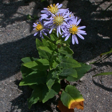 Herbaceous perennial from a branched caudex or short rhizome; stems 30-120 cm, densely pubescent with short, spreading hairs to subglabrous below the inflorescence; leaves entire or toothed, scabrous to glabrous above, usually shortly and loosely hairy beneath, at least the lower leaves cordate or subcordate at the base and petiolate, lance-ovate to ovate, those above variable in size and shape, but some either sessile and cordate clasping or with the petiole enlarged and auriculate-clasping at the base; inflorescence paniculiform, the branches and well developed peduncles spreading and bracteate; involucre 4-7 mm, usually puberulent; involucral bracts imbricate, acute or acuminate, often minutely purple-tipped; rays 10-20, blue or lilac.