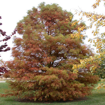 A deciduous conifer. The fall color is not all that great, at best reddish-brown, but the summer foliage is rich green and has a very soft look to it. Native to the southeastern U.S. but cold hardy much further north. Older plants develop "knees", which are upright roots that are thought to aid in gas exchange.
