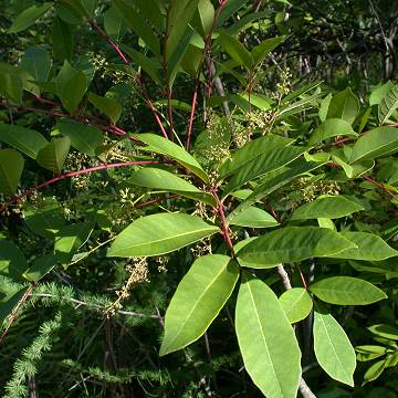 Poison Sumac produces a resinous oil (Urushiol) like that found in Poison ivy. The oil darkens when exposed to the air. In southern Wisconsin it is frequently found around the borders of conifer swamps where the swamp transitions to upland. It is reported to induce an allergic reaction in people reasonably immune to the effects of poison ivy. The fall color is quite stunning. The persistent fruit probably represents an important winter food source for birds and small mammals.
