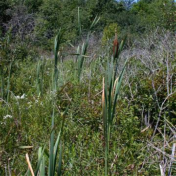 Rhizomatous perennial to 3 m. Leaves flat, 10-23 mm wide. Staminate and pistillate parts of the spike contiguous, or rarely separated by less than 4 mm; pistillate portion brown, 10-15 cm long and 2-3 cm thick at maturity; pistillate bracteoles lacking; pollen in tetrads.