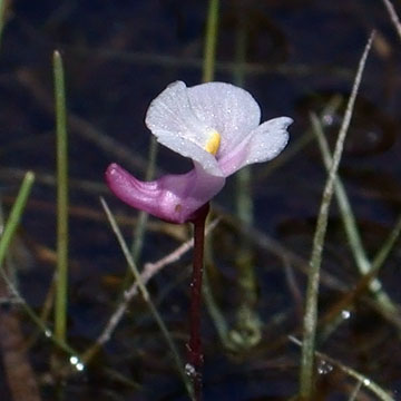 Herbaceous perennial; stems delicate, horizontal just below the surface of the soil or on the surface in shallow water, producing linear leaves to 3 cm and from the base of each 1-2 delicate roots with or without bladders; flowering branches erect, 2-10 cm, each with 1(2) flowers; bract tubular, surrounding the stem, its margin notched; flowers violet, 1 cm, tipped backward on the pedicel and facing upward, the spur almost horizontal; lower lip 3-lobed, the palate scarcely developed.