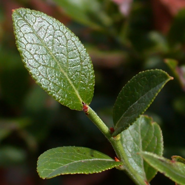 Colonial, deciduous shrub to 60 cm. Leaves more or less elliptic, to 3 cm long and 1/3 to 1/2 as wide, serrulate, mostly glabrous and occasionally glaucous. Flowers jointed to the pedicel; calyx and pedicel typically glaucous; corolla cylindric to urn-shaped, 4-6 mm; anthers not spurred. Fruit blue-glaucous or more rarely black, 5-10 mm.