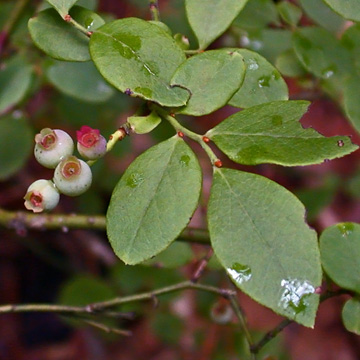 One of several species of "lowbush" blueberries. It differs from others in having glaucous leaves with entire margins, glabrous or at most sparsely pubescent branchlets, and and blunt winter bud scales. The veins of the leaf are also markedly anastomose.