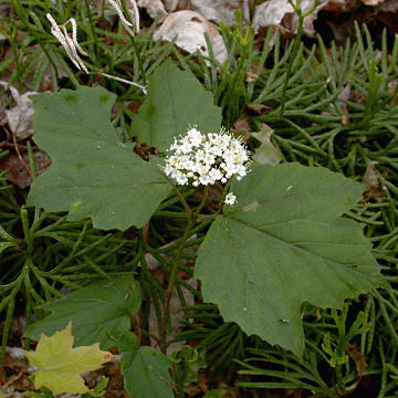 Small, upright shrub to 2 m. Leaves palmately veined, 3-lobed, maple-like, coarsely toothed. Inflorescence a mostly 7-rayed cyme, 3-5 cm wide; flowers white. Fruit blue-black, ellipsoid or subglobose, 8 mm.