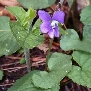 Acaulescent perennial from a thick, fleshy rhizome, stolons not produced. Plants heterophyllous, early and late season leaves unlobed, mid-season leaves with 3-5(-7) lobes, the middle segment larger than the lateral segments and usually unlobed; sepals lanceolate, auricles 0.5-1 mm; petals violet, lower three white basally, lower three and upper two sometimes violet-veined; lateral petals bearded, lowest petal 1.5-2.5 cm and sometimes bearded, spur white, 2-3 mm; capsule ellipsoid, 0.5-1.5 cm, glabrous; seeds beige, mottled to bronze, 1.5-2.5 mm.