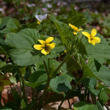Can be distinguished from V. rotundifolia (round-leaved yellow violet) by the presence of cauline leaves. The first three images were taken in a forest preserve in northeast IL, while the last two were taken in central NY.