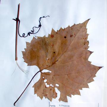 Deciduous vine. Stems high-climbing, the pith interrupted by a diaphragm 0.5-1 mm thick at each node (2 mm at maturity); branches of the current season green to gray or brown; tendrils or panicles produced opposite most leaves, commonly lacking each third leaf. Leaves rotund, 10-20 cm, usually with 3 forward pointing lobes, coarsely and sharply serrate, the teeth often longer than wide with one or both sides concave, pubescent beneath when young, remaining pubescent in the vein-axils and sometimes along the veins. Panicles 5-10 cm. Fruit black, glaucous, 6-12 mm.