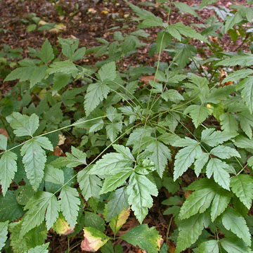 Low woody shrub; wood yellow; stems 30-50 cm; leaves long-petiolate, pinnately compound; leaflets mostly 5, lance ovate to broadly ovate, acute or acuminate, toothed to deeply cleft; inflorescences 5-12 cm, with small, purple-brown flowers; petals absent; sepals lanceolate, broadly clawed, 3 mm, spreading; stamens and staminodes, 1 mm; follicles thin-walled, pale brown, sparsely hairy.